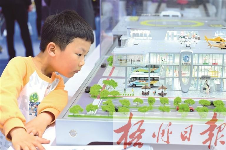 4月26日,小朋友在第四届科交会上观看一款低空枢纽起降场模型。新华社记者 周牧 摄