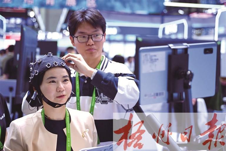 4月26日,参会人员在第四届科交会上体验一款脑机接口产品。新华社记者 周牧 摄