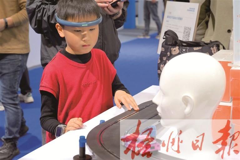 4月26日,小朋友在第四届科交会上体验一款脑控赛车。 新华社记者 黄博涵 摄